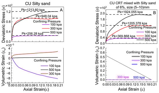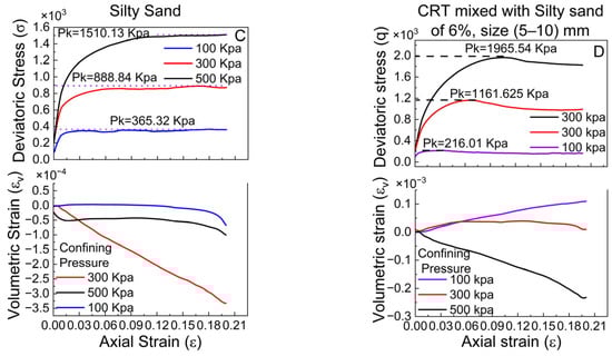The deviatoric stress increases to 902.5 kPa and 1502.4 kPa when a 6% crumb tire is added to the silty sand soil at confining pressures of 300 kPa and 500 kPa (Figure 7B), respectively. There are also ambiguous peaks at an axial strain of 0.2. It seems that the more tension there is, the more stress there is []. A favorable relationship between the volumetric strain and axial strain is demonstrated by plotting the volumetric strain against the axial strain for confining pressures of 100 kPa, 300 kPa, and 500 kPa.