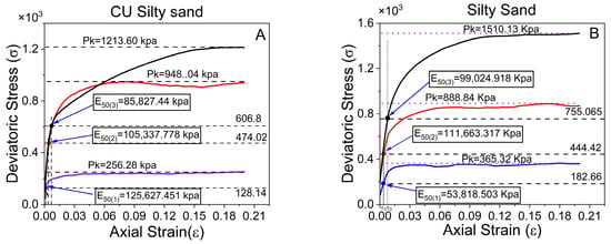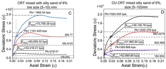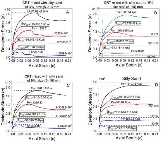 Interestingly, the average stiffness of silty sand containing 3% crumb tires differs from that of pure silty sand (Figure 11A,D and Table 7). This implies that the influence on the deformation behavior of the silty sand at a low ratio is less noticeable and that the intrinsic qualities of the silty sand take center stage at a reduced tire content. At ratios of 6% and 9%, the stiffness is less than that of pure silty sand. Generally, the stiffness modulus (E50) tends to decrease as the deviatoric stress increases. In soil mechanics, this phenomenon is frequently observed, where more stress causes more substantial deformation and a commensurate decrease in the stiffness of the soil [] which is different in this observation, see Table 7.