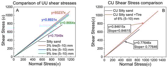 In general, on the basis of the triaxial test results of the UU and CU tests on CRT mixed with silty sand at a 6% crumb tire, a size of 5–10 mm, and pure silty sand (see Table 10 and Table 11, Figure 14), the CU provides a high friction angle of 37.8 degrees greater than 0.8 UU (Figure 14A,B), which implies that the higher the friction angle is, the higher the shear stress failure line (Table 10 and Table 11). However, on CRT mixed with silty sand, the UU provides higher shear stress because its friction angle of 41.7 degrees is greater than that of the 1.5 degree, which is 40.2 degrees in the CU tests. For CRT mixed with silty sand, Youwei Xu et al. reported that wet tests consistently yield lower shear strengths than dry tests do, leading to diminished apparent cohesions and friction angles [].