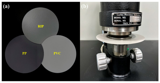 Three types of decorative materials and the air permeability meter. (a) RIP, PP and PVC; (b) air permeability measurement experiment.
