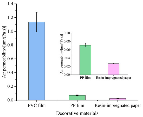 The release process of pollutants from wood-based panels can generally be divided into three stages: internal diffusion within the panel, gas-solid interface partitioning and dispersion into the air layer [14]. The addition of decorative materials and their permeability characteristics significantly influence the distribution coefficient of pollutants in the gas-solid interface layer, thereby affecting the overall release dynamics. Higher material permeability corresponds to greater surface porosity and a lower pollutant partition coefficient, promoting easier pollutant emission [15,16,17]. Figure 2 illustrated the permeability test results of three decorative materials.