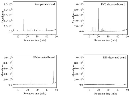 The total ion current (TIC) chromatograms of undecorated particleboard, PP-decorated particleboard, PVC-decorated particleboard and RIP-decorated particleboard were shown in Figure 3. The TVOC emission levels before and after decoration treatments were illustrated in Figure 4 and detailed chemical compositions and emission concentrations of VOCs are listed in Table 1.