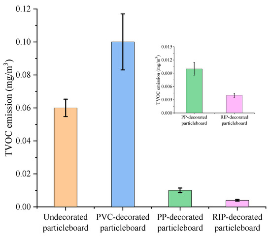After 72 h of emission testing in a 1 m3 VOC chamber, the TVOC release concentrations of undecorated particleboard, PVC-decorated particleboard, PP-decorated particleboard and RIP-decorated particleboard were 0.06 mg/m3, 0.10 mg/m3, 0.01 mg/m3 and 0.004 mg/m3, respectively. The TVOC emission levels of each type of panel are consistently low, with all meeting or even exceeding the Green Benchmark tier specified in GB/T 35601-2024 [27].