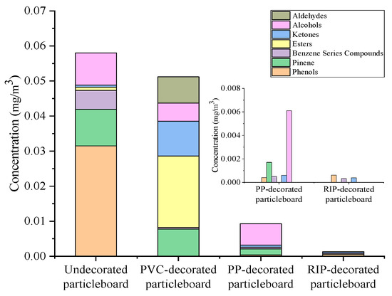 As shown in Table 3, compared to undecorated particleboard, impregnated film paper decoration effectively suppressed all VOC categories except benzene series compounds. Among the VOCs by PP-decorated particleboard, except for pinene, which decreased by 34% and benzene series compounds, the emissions of other substances decreased by more than 80%. In contrast, PVC-decorated particleboard demonstrated a 25% decline in alcohols, a 43% reduction in pinenes and an over 90% decrease in aldehydes and ketones. However, benzene series compounds and esters increased by approximately 16-fold and 22-fold, respectively. Phenolic compounds were introduced, which were absent in undecorated particleboards. These factors contributed to a 67% increase in TVOC emissions for PVC-decorated particleboard.