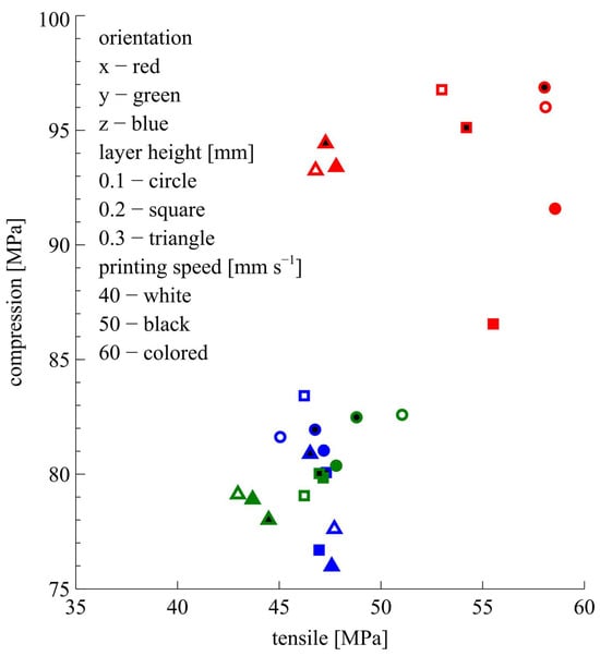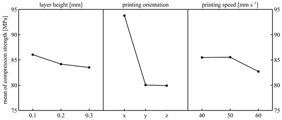 | Experimental No | Layer Height [mm] | Printing Orientation | Printing Speed [mm/s] | Tensile Strength [MPa] | Tensile Strength Upper Value [MPa] | Tensile Strength Lower Value [MPa] | Compression Strength [MPa] | Compression Strength Upper Value [MPa] | Compression Strength Lower Value [MPa] |