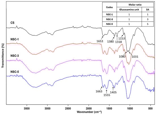 As expected, increasing the molar ratio of succinic anhydride (SA) to glucosamine units (or per NH2 group) resulted in a higher degree of substitution (DS). The highest DS value was observed for NSC-5 (57.2%), corresponding to a 5:1 molar ratio of succinic anhydride to glucosamine units (or per NH2 group). This was followed by NSC-3 (37.3%) at a 3:1 ratio and NSC-1 (11.3%) at a 1:1 ratio; the results are summarized in Table 1.