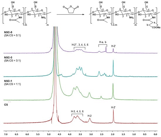 1H-NMR spectra of chitosan and N-succinyl chitosan products (CS = chitosan and SA = succinic anhydride).
