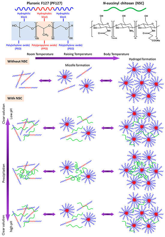Schematic of in situ gelation mechanism of pH- and thermo-responsive PF127:NSC aqueous solution.