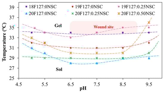 At lower concentration of PF127 that can undergo thermo-reversible gelation below 35 °C, which is nearly skin temperature, preliminary investigations were carried out using concentrations ranging from 17 to 20% w/v. At the lowest PF127 concentration (17% w/v), no gel formation was observed near skin temperature or within the pH range of 5.0–9.5, likely due to weak intermicellar interactions. Within the same temperature and pH range, PF127 at concentrations of 18–20% w/v successfully formed gels. Based on these results, a PF127 concentration of 18–20% w/v was selected as a studied range concentration, which exhibits suitable thermo-reversible properties and is also widely used in previous studies for biomedical materials applications [25]. When the PF127 concentration increases to 19% and 20% w/v (19F127:0NSC and 20F127:0NSC), the Tgel decreases, indicating enhanced micelle formation and stronger intermolecular interactions that facilitate gelation at lower temperatures.