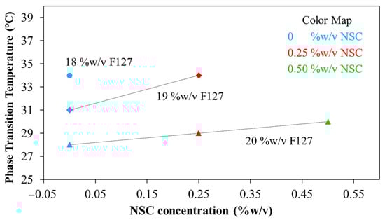 Phase transition temperature at pH 7.4 of the PF127:NSC spray solution with different PF127 and NSC concentrations.