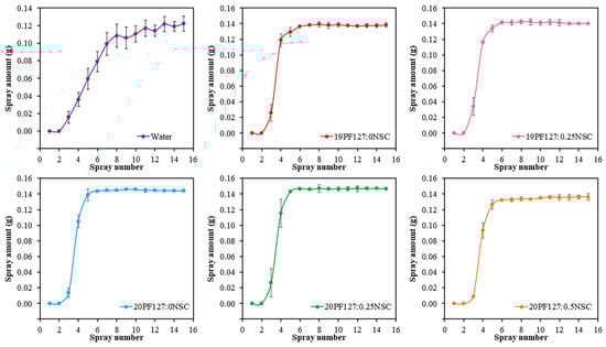 Sprayability was evaluated based on the amount of hydrogel solution released using a normal spray bottle. As shown in Figure 7, all hydrogel formulations exhibited consistent release volumes, with approximately 0.14 g of solution discharged from the nozzle after the fifth or sixth spray. This behavior aligns with previously reported findings [5]. Interestingly, compared to pure water, hydrogel formulations released slightly more mass per spray. This may be attributed to their higher viscosity, which influences the dynamics of spray ejection. Despite the increased viscosity, the hydrogel solutions remained sufficiently fluid to be atomized consistently and efficiently. All formulations containing PF127, with or without NSC, demonstrate a rapid increase in spray amount, typically reaching a plateau after five to six sprays. The cumulative amount stabilizes at around 0.14–0.16 g. Error bars are smaller than those in the water sample, indicating improved reproducibility and consistency.