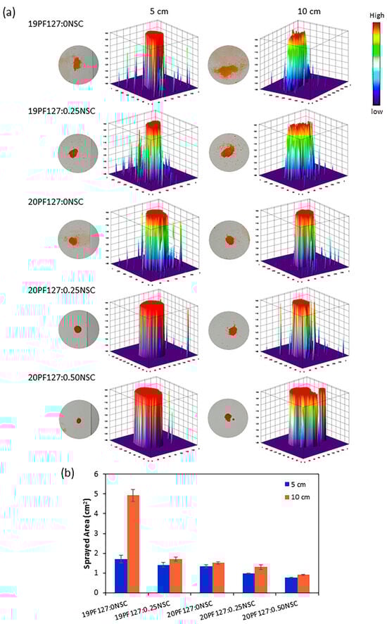 Spray characterization: (a) the effect of the spray distances on the spray thickness distribution, and (b) quantitative analysis of the sprayed area (n = 3, mean ± SD, xPF127:yNSC indicates a mixture with x% w/v PF127 and y% w/v NSC).