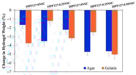 A moist wound environment is widely regarded as optimal for wound healing. To encourage wound debridement and create a matrix for skin regeneration, it is essential to maintain a favorable moisture balance—to avoid an excessively wet or dry environment. The ability to donate fluid to wounds benefits autolytic debridement, while the ability to absorb wound exudate and debride slough benefits the re-epithelialization of healthy tissue. Overhydrating wounds can cause peri-wound tissue to macerate, which can prolong the healing process. Therefore, hydrogel dressings have to be able to absorb more moisture in excess exudative situations and provide moisture to dry wounds. To evaluate fluid affinity, water absorption and donation properties were assessed using agar and gelatin, following the standard “EN 13726-1:2002 test methods for primary wound dressings—Part 1: aspects of absorbency”. The ability of PF127:NSC spray formulations shows that a decreasing change in weight resulted in all spray formulations exhibiting a higher donation than absorption of liquids (Figure 9). All formulations exhibit negative changes in weight, indicating weight loss, which is generally attributed to water evaporation or fluid loss over time. Formulations without NSC (19PF127:0NSC and 20PF127:0NSC) show moderate weight loss at both temperatures. However, as PF127 concentration increases from 19% to 20%, slightly greater weight loss is observed, possibly due to differences in network density or initial water content. The addition of NSC further increases weight loss. Notably, 20PF127:0.50NSC exhibits the highest weight loss among all formulations, with over 6% reduction. Higher NSC content may increase hydrophilicity and fluid affinity, leading to higher initial water uptake but also greater susceptibility to evaporation under thermal conditions. Considering that the target wound type for the spray format was dry to low-exuding wounds, the resulting PF127:NSC spray formulations in this study were considered a positive outcome, showing good buffering capacity for moisture handling in the wound bed.