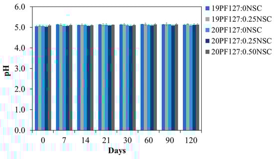 Data obtained for short-term stability studies of the formulation, which was stored at 4 °C for 120 days, is presented in terms of clarity, gelation time, gelling capacity and spreadability (Table 2). The formulation kept at 4 °C for 60 and 120 days after the initially data recording did not exhibit any change concerning the clarity and color of the preparation. There also was no sign of precipitation in the stored spray solutions, and no change was seen in the viscosity of the formulation. A slight increase in gelation time was recorded over the period of storage for some formulations (19PF127:0NSC, 20PF127:0NSC, and 20PF127:0.25NSC), but this change remained within acceptable limits for clinical application. However, the 20PF127:0.50NSC formulation exhibited a noticeable increase in gelation time, while 19PF127:0.25NSC completely lost its ability to form a gel, suggesting a decline in thermo-responsive performance. Considering the effect of storage stability on the gelling capacity results, 19PF127:0NSC and 20PF127:0.50NSC solutions exhibited changes after 60 days of storage. Both formulations initially formed gels when dropped into a pH 7.4 solution at 35 ± 1 °C but dissolved rapidly within a few minutes. Minor variations were also observed in spreadability results for certain formulations after long-term storage. In addition, pH measurements showed a slight but statistically insignificant increase (p > 0.05) during the first 7 days, with no further changes detected over the remaining study period (Figure 10). Over the period of the experiment, the formulations 20PF127:0NSC and 20PF127:0.25NSC demonstrated good chemical and physical stability for at least 120 days when stored at 4 °C, supporting their suitability for further development as sprayable wound dressings.