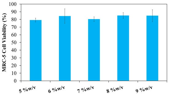 This study aimed to develop a sprayable hydrogel incorporating both thermo- and pH-responsive polymers. The formulation designated as 20PF127:0.25NSC was selected for further investigation due to its favorable physicochemical properties during prolonged storage compared to other formulations. This hydrogel consists of PF127 as a thermo-responsive polymer and NSC as a pH-responsive polymer. Therefore, this formulation was used to evaluate the effect of hydrogel composition on biocompatibility. The cytotoxicity of the PF127:NSC sprayable hydrogel was evaluated using an MTT assay on MRC-5 human fibroblast cells. The sprayable hydrogel solution at a concentration of 20% w/v could not completely dissolve in the medium at 37 °C, necessitating the use of a serial dilution. As a result, lower concentrations of 5, 6, 7, 8, 9, and 10% w/v were prepared for cytotoxicity evaluation (Figure 11). Cell viability remained above 80% for PF127:NSC hydrogel concentrations of 5, 6, 7, 8, and 9% w/v, indicating good biocompatibility. According to ISO 10993-5 standards, materials that maintain cell viability above 70% are considered non-cytotoxic [32,33]. Consequently, based on the percentage of viable cells, the PF127:NSC hydrogel can be considered non-cytotoxic at concentrations ≤9% w/v. These results underscore the potential of this formulation for safe use as a wound dressing in biomedical applications.