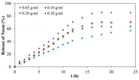 Neem-containing formulations: in the first step, PF127:NSC sprayable hydrogel solution was prepared, and the pH was adjusted to 5 using 0.1 M of NaOH and HCl. Then, varying amounts of neem extract (0.05, 0.10, 0.20, and 0.30 g/mL) were added to the polymer solution and stirred at room temperature for 1 h until a homogenous solution was achieved. A total of 2 mL of the formulation was placed into a vial and transferred to a water bath set at 37 °C for gel formation. After gelation occurred, 3.0 mL of phosphate-buffer saline (PBS, pH 7.4), used as the release medium, was added to the vial, which was placed in a water bath set at 37 °C. At predetermined time intervals, 1 mL of the release medium was removed for the measurement, and the same volume of fresh PBS medium was added to replace it. The release medium was filtered using a 0.22 μm membrane filter before the neem extract was quantified using a UV-vis spectrometer (microplate reader, BioTek, Winooski, VT, USA) set at 355 nm [10].