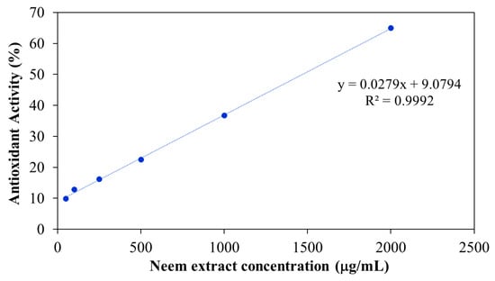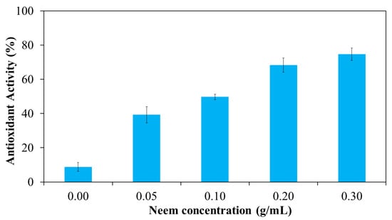 The antioxidant activity of free neem extract was evaluated based on its scavenging ability against free 2,2-diphenyl-1-picrylhydrazyl (DPPH) radicals. Neem concentrations were prepared in methanol by serial dilution, ranging from 50 to 2000 μg/mL. After that, 100 µL of 0.004% DPPH solution in methanol was added to 0.3 mL of each neem concentration and left in a dark place for 30 min. The change in absorbance of DPPH at 517 nm was measured using a microplate reader [12]. The antioxidant activity of neem extract was calculated using the following equation:
