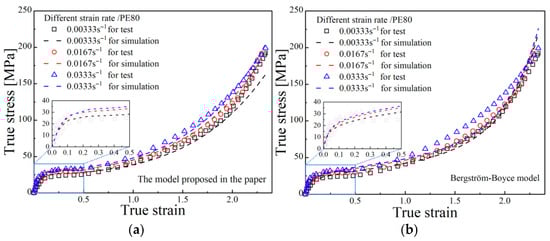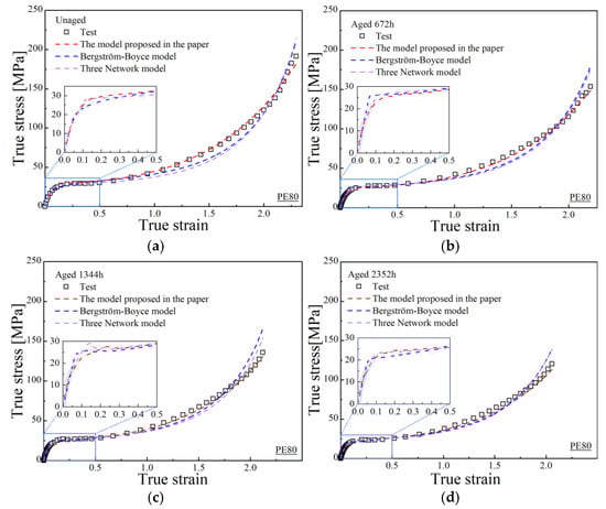 Figure 7 first presents the fitting performance of true stress–strain curves for PE80 under different strain rates, comparing the proposed model in this study with the BB model and the TNM. Figure 8 illustrates the fitting results for quasi-static true stress–strain curves at different aging times, also comparing the proposed model with the BB model and the TNM. Table 7 and Table 8 shows the relevant goodness of fit for PE80 and PE100 pipes.