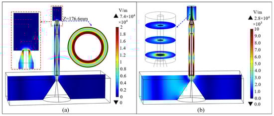 To investigate the electric field distribution within the designed MPJ and the propagation behavior of electromagnetic waves in the presence of plasma, Figure 2 illustrates the microwave electric fields in the MPJ system with and without the presence of a plasma column. These simulations were performed using the commercial finite element software COMSOL Multiphysics 6.3. The computational model without plasma comprised a total of 1,424,748 mesh elements and a complete calculation required approximately 10 min. When considering the plasma column based on the Drude model, the total mesh elements enhanced to 1,821,880 and its computational time increased to approximately 20 min. All simulations were conducted on a computer equipped with an Intel i7-10700K processor and 128 GB of RAM. As shown in Figure 2a, the electric field reaches its peak intensity at the tip of the nozzle, where the localized high-field region enhances gas breakdown efficiency and effectively triggers the discharge process. It is noteworthy that, once gas discharge occurs, the resulting plasma behaves as a dynamic load that can absorb, reflect, and even shield electromagnetic waves. If the structural design is inappropriate, such as an excessively small discharge gap, after triggering the gas discharge, the coupled effects of the electromagnetic field distribution and gas flow near the nozzle may confine the plasma within the discharge gap, manifesting as fan-shaped or rotating discharges [45], thereby hindering the formation of an outward-propagating plasma jet.