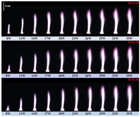 Conversely, as the gas flow rate increases, the jet length tends to decrease slightly, and the luminous region becomes more confined. This phenomenon is likely due to the reduced residence time of reactive species within the discharge region under high flow velocity conditions, which limits the continuity of axial discharges. In addition, the increase in gas flow promotes lateral diffusion of the jet, which contributes to a more uniform spatial distribution of the plasma plume. It is worth noting that the evolution of jet temperature under different combinations of microwave power and gas flow rate remains unclear and requires further investigation through dedicated measurements and energy transport analysis.