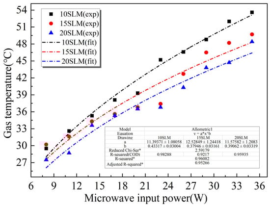 Gas temperature in the jet tail for different gas flow rates at different microwave input powers. (Note: The physical quantities marked with * in the table are indicators of the fitting effect. The closer the value is to 1, the better the fitting effect).