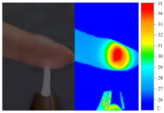 Figure 6 displays the visible light image and corresponding infrared thermogram of a human fingertip after approximately 150 s of direct exposure to an argon plasma jet. The thermal distribution clearly indicates that the plasma jet induces a highly localized thermal effect restricted to the area of direct skin contact, with no evident thermal conduction to surrounding tissues. Remarkably, despite prolonged contact, the surface temperature remained around 35 °C without eliciting thermal pain, confirming the plasma’s stable low-temperature behavior under atmospheric conditions. This sustained low-temperature operation enables safe surface modification of thermosensitive polymers, effectively avoiding heat-induced deformation, softening, degradation, or performance loss. Additionally, the continuous treatment mode enhances the diffusion and interfacial reactivity of active species (e.g., oxygen-containing radicals), addressing the limitations of pulsed low-temperature treatments regarding modification depth and surface uniformity. These findings provide robust support for controlled and efficient polymer surface functionalization via low-temperature plasmas.