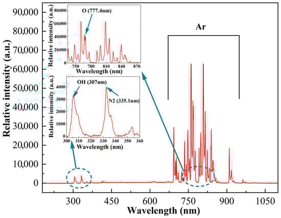 Figure 7 shows the emission spectrum of an argon plasma generated at an input power of 14 W with an argon gas flow rate of 20 SLM. The spectrum was acquired using a spectrometer (ER4000EX; Shanghai choptics Instrument Equipment Co., Ltd., Shanghai, China.) with a resolution ranging from 0.1 to 4.88 nm. The optical probe was positioned 4 cm from the nozzle exit, vertically aligned with the nozzle axis, and 2.5 cm horizontally from the center of the plasma plume. Spectral analysis indicates that the emission spectrum at this location is dominated by spectral lines corresponding to various energy levels of atomic argon. Simultaneously, a Vegard–Kaplan system was detected at 335.1 nm ( and N2 was detected at 335.1 nm [50]. Notably, characteristic peaks of highly reactive radicals were observed, including the highly reactive radicals like OH (2S → 2P) at 307 nm [51] and excited atomic oxygen (O, 3p5P → 3s5S) at 777.4 nm [52]. These strong oxidizing active substances have significant application potential in the fields of plasma–surface interaction and material surface modification.