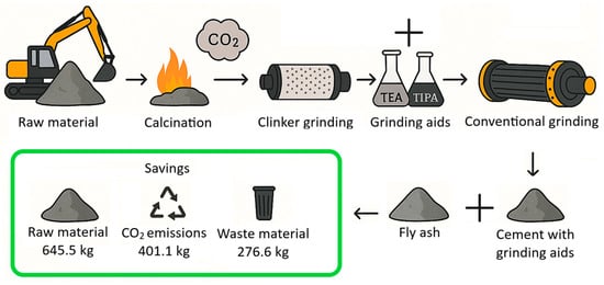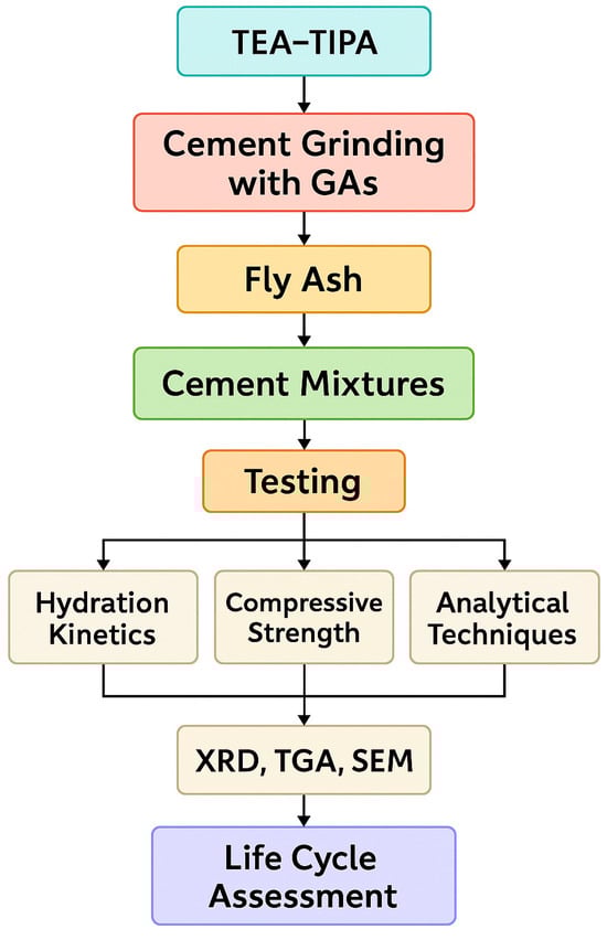 Cement is the component that requires the highest amount of energy and cost among the materials used in cementitious systems such as concrete. This fact has led to the use of alternative mineral additives in cement production and/or in the preparation of cementitious systems, aiming for more economical and ecological production [1,2,3,4,5]. To this end, mineral additives such as fly ash (FA), ground granulated blast furnace slag, and calcined clay have been incorporated into cement production to reduce clinker content and to promote more sustainable designs [1,4,6,7]. However, these alternatives may lead to slower early strength development in cementitious systems where the clinker is partially replaced with mineral additives [4,7,8,9]. To overcome this issue and particularly to achieve higher early strength within the first 24 h of hydration, a finer grinding strategy has been adopted, focusing on increasing the proportion of particles smaller than 3 µm [7,10]. Nevertheless, producing finer-grained cements requires greater energy consumption during the clinker grinding stage. Hence, grinding aids (GAs) are employed during the clinker grinding stage to achieve a finer particle size distribution in a more energy-efficient manner. Grinding aids support the formation of fine cement particles with desired properties by reducing electrostatic forces and preventing agglomeration between particles [10,11,12,13,14,15].