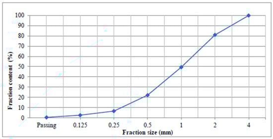 The preparation of the mortar mixtures utilized washed river sand aggregate, which complied with TS EN 196–1 [29] and exhibited a particle size range of 0–4 mm. The gradation curve of the aggregate is presented in Figure 2. The aggregate’s properties were evaluated per TS EN 1097–6 [30], revealing a saturated surface dry (SSD) specific gravity of 2.64 and a water absorption of 1.2%.