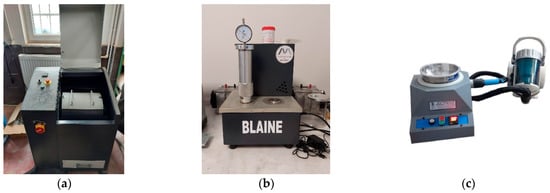 (a) A ball mill for material comminution; (b) an automatic Blaine apparatus for specific surface area measurement; and (c) an air jet device for particle size distribution analysis.