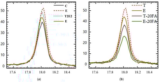 When examining cements containing pozzolan, it is observed that the lowest and highest Ca(OH)2 contents are found in the E (100TEA) and T (100TIPA) mixtures, respectively. The E mixture contains a higher amount of Ca(OH)2 than the control mixture in the pozzolan-free mixture and a lower amount of Ca(OH)2 than the control mixture in the pozzolan-containing mixture. This is due to TEA significantly increasing the solubility of SiO2 in the presence of pozzolan, compared to TIPA. Thus, it has been determined that TEA better supports pozzolanic activity than TIPA. Chang et al. [35] reported that TEA supports aluminates in cement and slows down silicate phases, while TIPA accelerates the ferrite phase. Additionally, both additives have been reported to support pozzolanic activity by promoting the dissolution of SiO2 in pozzolanic systems. The Ca(OH)2 peaks of the C, T, T2E2, and E mixtures, as well as the T and E mixtures containing 20% FA, are presented in Figure 5.