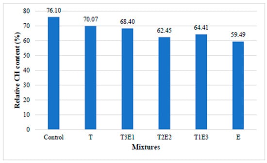 As depicted in Figure 5a, for cementitious systems lacking fly ash, the control mixture exhibits the lowest Ca(OH)2 content, whereas the T mixture displays the highest. The increase in Ca(OH)2 content is observed to be directly proportional to the TIPA content in the GA used. As seen in Figure 5b, the Ca(OH)2 variation concerning FA content is presented for mixtures containing TIPA and TEA. To gain a deeper insight into the impact of GA content on pozzolanic activity, the relative Ca(OH)2 content percentages of each mixture, compared to the mixture prepared without FA, are shown in Figure 6.