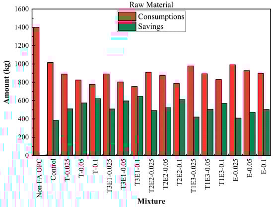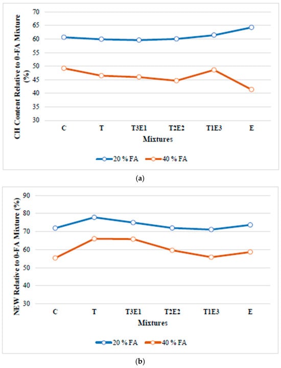 To more clearly demonstrate the changes in pozzolanic activity, the relative Ca(OH)2 contents and NEW of the FA-substituted mixtures, compared to the non-FA mixtures, are shown in Figure 7.