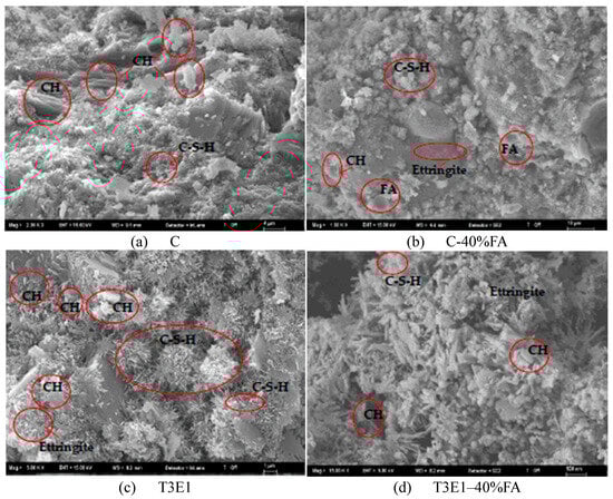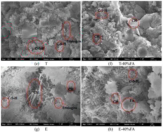 When examining Figure 8a,c, it is noticeable that larger Ca(OH)2 structures are present in the control mixture without FA. In the T3E1 mixture, however, the Ca(OH)2 structures have shrunk, the C-S-H phase has increased, and a more compact appearance has emerged. Similarly, in the T mixture, the C-S-H phase is more abundant compared to the control, and the overall appearance appears more void-free (Figure 8e).
