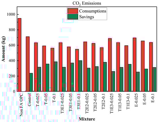 As seen in Figure 7, especially with the increase in FA replacement, a significant decrease in CH content is observed in the E mixture containing 100% TEA. This is thought to be due to the increased pozzolanic activity caused by the TEA additive. The increased pozzolanic activity of both TEA and TIPA could be due to their complexation with Ca+2, Al+3, and Fe+3 metals, enhancing the dissolution effect [35].