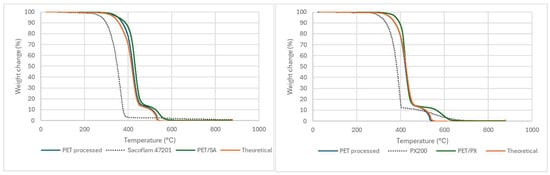 Neat PET thermally degrades in two steps, starting around 350 °C, without leaving residue over 550 °C. The first decrease in weight was assigned to the pyrolytic decomposition of PET, followed by a second reoxidation step at temperatures over 500 °C. The incorporation of flame retardants significantly affects the thermal degradation of the PET/FR blend. This is evident in the curves of PX200 and HFR 693, where the interaction of PET with the flame retardant gives a higher thermal stability to the generated char, a with decomposition temperature 50 °C higher than of the plain PET and with a residue that remained at 550 °C (Table 2). Furthermore, in the case of HFR 693, in addition to increasing the PET’s compound thermal stability, it also promotes the generation of additional char (see Table 2, residue at 450 °C).