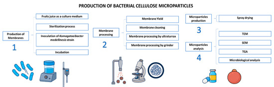 Scheme of production and characterization of microparticles of bacterial nanocellulose.
