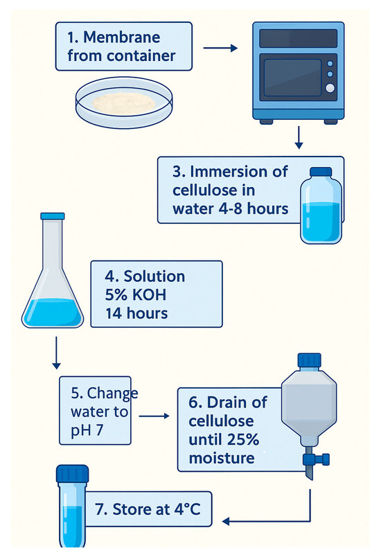 The purpose of this step was to remove cellular debris from the culture medium that was trapped in the nanocellulose membranes. At the end of incubation, the nanocellulose membranes were collected and washed with water. The membranes were cut into little pieces manually and then put in a VITA-PREP®3 mixer (Olmsted Township, OH, USA) at 6000 rpm followed by immersion in water for 4 to 8 h to eliminate colors and impurities. Then, the samples were washed using 5 wt % KOH aqueous solution, keeping the cellulose immersed for 14 h. Finally, the BNC samples were rinsed with water until they reached pH 7 and filtered by cloth before storage at 4 °C [2]. The membranes from tests 1, 2, 3, 6, and 7 needed to be cleaned up two or more times to remove color; the KOH process including the rinse until pH 7 was repeated as well. The process of washing the membranes is shown in Figure 2.