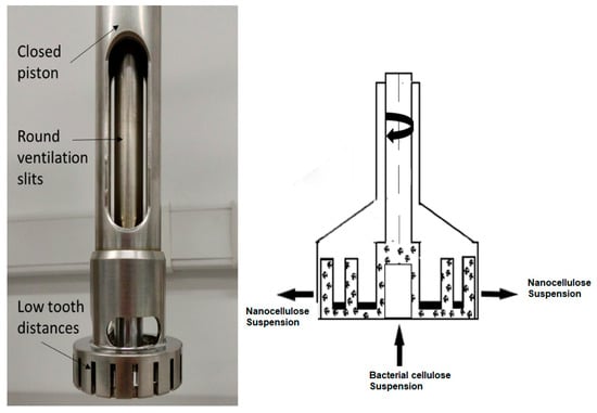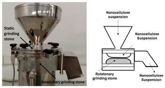 Nowadays, grinding is one of the most common methods, as it is not hindered by clogging issues and it can improve the efficiency of the fibrillation process. Its operation is based on the shear stress imposed by two non-porous ceramic discs (Figure 4), one rotating at speeds between 750 and 3000 rpm, while the other is kept stationary [13,14].