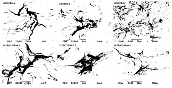 The image analysis presented in Table 3 was performed using ImageJ software version 1.53, following the procedures recommended by Hartig [15]. Each micrograph (Figure 6) was first converted to 8-bit grayscale and then processed by applying a thresholding technique to isolate regions corresponding to bacterial nanocellulose agglomerates. The threshold was adjusted to distinguish darker areas (indicative of cellulose clusters) from the background, allowing for consistent segmentation across images. Following thresholding, the “Analyze Particles” function in ImageJ was used to extract key morphological parameters. The total area (µm2) represents the absolute area occupied by the agglomerates, while the %area denotes the proportion of the image occupied by these agglomerates. The perimeter (µm) parameter was used to quantify the total boundary length of each detected agglomerate, serving as an indicator of shape complexity and spatial extent. The integrated density (AU), defined as the product of the area and the mean gray value of each agglomerate [11], was calculated to provide a composite measure of both size and intensity of the cellulose clusters. This parameter helps us infer the concentration and compactness of the bacterial nanocellulose structures. As shown in Table 3, the Ultra Turrax-treated samples generally exhibited higher total area, perimeter, and integrated density values compared to the grinder-treated samples for samples A and B, suggesting a more extensive agglomeration behavior under Ultra-Turrax conditions. Conversely, sample C displayed greater agglomeration in the grinder condition, though Ultra-Turrax led to larger but less-dispersed clusters. These findings highlight the influence of mechanical treatment on the dispersion and structural organization of bacterial nanocellulose.