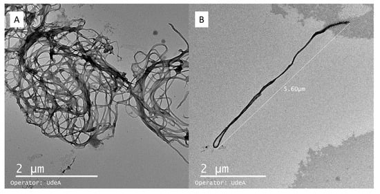 TEM analysis is shown in Figure 7. The micrograph in Figure 7A reveals a fibrillar network structure composed of bacterial nanocellulose nanoribbons. These nanoribbons exhibit a typical width ranging from 30 to 50 nm and appear entangled, forming a porous mesh. In Figure 7B, an individual nanoribbon is clearly distinguished, with an estimated length of approximately 7–8 µm, which aligns with previous reports for bacterial nanocellulose fibers in aqueous dispersion. Measurements were conducted on at least 50 nanoribbons across multiple fields of view to ensure representative analysis. The average fiber diameter was 42 ± 6 nm, indicating a relatively homogeneous nanoscale morphology.