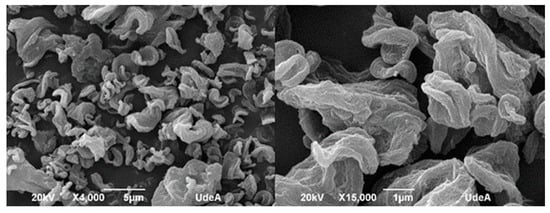 At 15,000× magnification, the surface of the microparticles appeared rough and irregular, which can be attributed to the interweaving of nanoribbons forming a three-dimensional network. This morphology supports the idea that during the spray-drying process, the bacterial nanocellulose fibers tend to aggregate into microscale spheres, driven by surface tension and drying kinetics. Consequently, most microparticles exhibit a quasi-spherical geometry, although many show irregularities and surface porosity.