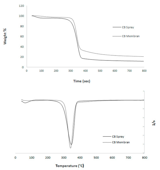 As shown in Figure 9, the thermograms of both spray-dried microparticles and membrane-formed bacterial nanocellulose exhibited similar thermal stability profiles. The maximum degradation temperature (T_max) for the BNC membranes was observed at 342 °C, while that of the BNC microparticles was slightly higher, at 345 °C. The onset of thermal degradation occurred at approximately 270 °C for both samples, and total mass loss by 800 °C was 89.6% for membranes and 90.1% for microparticles, indicating a comparable organic content and thermal behavior.