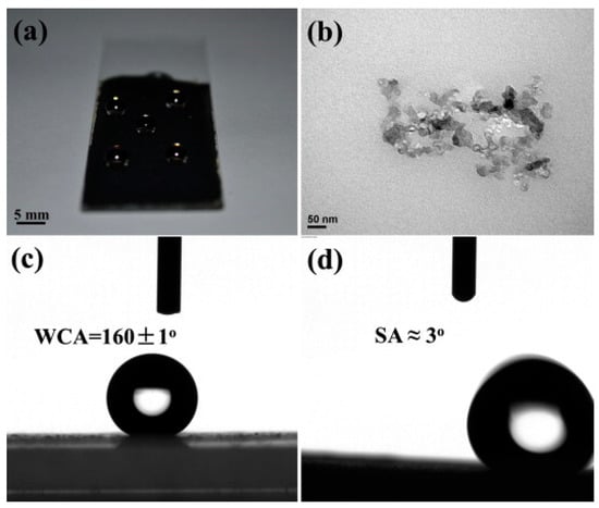 (a) Optical image of water droplets placed on a KB-PBZ composite coating, (b) TEM image of Ketjen black, (c) water contact angle, and (d) sliding angle of KB-PBZ composite coating. Reprinted with permission from Reference [6]. Copyright 2013 Elsevier.