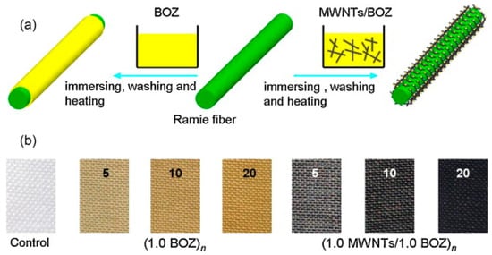 (a) Schematic illustration for the construction process of poly(BOZ) and MWNTs/poly(BOZ) nanocomposites on ramie fabric and (b) Pictures of the pristine ramie fabric (control), (1.0 BOZ)n and (1.0 MWNTs/1.0 BOZ)n systems. Reprinted with permission from Reference [63]. Copyright 2014 Elsevier.