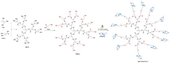 Chen et al. (2018) [8] synthesized a novel hyperbranched polymeric ionic liquid (HBP-AMIM+PF6−) using a two-step process: (i) esterification and (ii) Thiol-ene click reaction. Thiol-ended hyperbranched polyesters (THBPs) were synthesized by reacting hydroxyl-ended hyperbranched polyesters with 3-mercaptopropionic acid. The THBPs were reacted with 1-allyl-3-methylimidazolium hexafluorophosphate (AMIMPF6) under UV light, yielding HBP-AMIM+PF6−. This HBP-AMIM+PF6− was then blended into benzoxazine/epoxy (BA/ECC) systems and thermally cured via a multi-step heating process (120 °C to 200 °C) (Figure 3). The ionic liquid acted both as a reactive additive and a catalytic agent for curing. The integration of HBP-AMIM+PF6− into the BA/ECC matrix resulted in significant improvements in processing and performance.