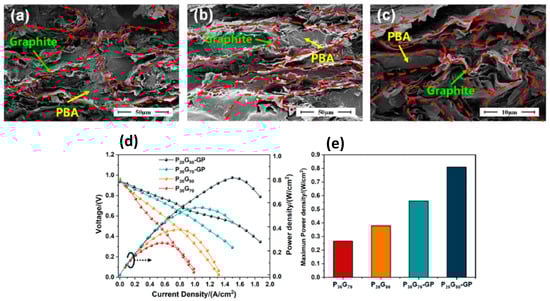 SEM images of different BPs’ internal sections: (a) P60G40, (b) P40G60, (c) P20G80; (d) performance combo chart; and (e) maximum power density of PEMFC single cell with composite BP P30G70, P20G80, P30G70-GP, and P20G80-GP. Reprinted with permission from Reference [71]. Copyright 2023 Elsevier.