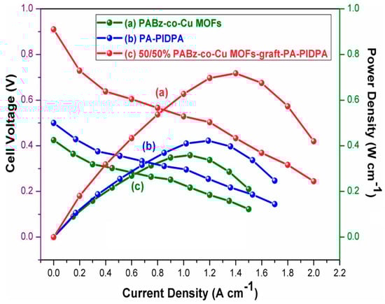 Fuel cell performance of 50/50% combination of PABz-co-Cu MOFs-graft-PIDPA, PA-PIDPA, and PABz-co-Cu MOFs at 150 °C without RH. Reprinted with permission from Reference [53]. Copyright 2024 Elsevier.