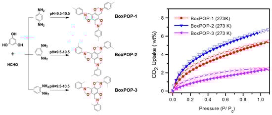 (Left) Heteroatom-rich porous organic polymers linked by benzoxazine, and (Right) CO2 uptake of porous organic polymers. Reprinted with permission from Reference [44]. Copyright 2018 Elsevier.