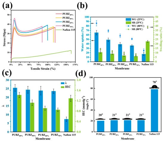(a) Tensile stress–strain curves, (b) WU and SR in 25 °C and 80 °C, (c) λ and IEC, and (d) Water contact angle. Reprinted with permission from Reference [79]. Copyright 2025 Elsevier.